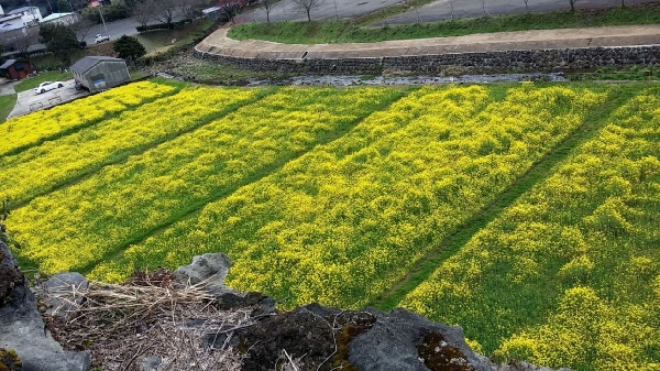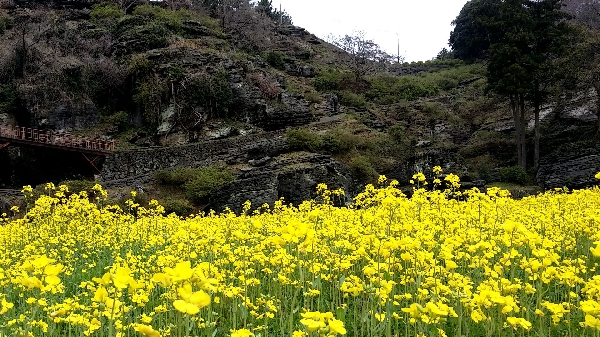 七ツ釜鍾乳洞周辺の菜の花が見ごろを迎えています