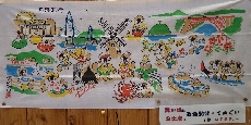 西海市の名所が描かれた「たぬき絵の手ぬぐい」をプレゼントしています。