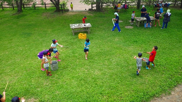 サンサンと太陽が照りつける中、本日は2組の学童保育の皆さんが水鉄砲作り体験でお越し頂きました