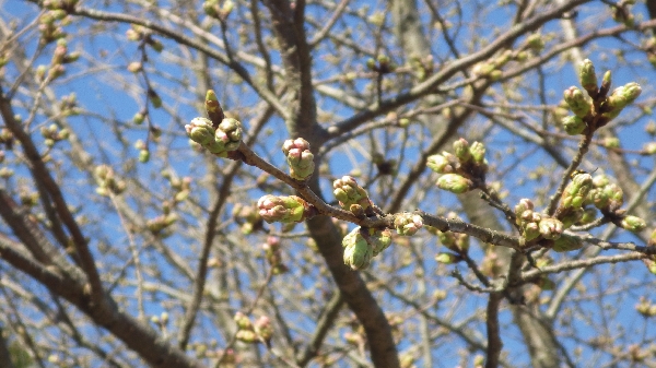 ソメイヨシノの膨らみも大きくなり、先の方もほんのりピンクに・・・