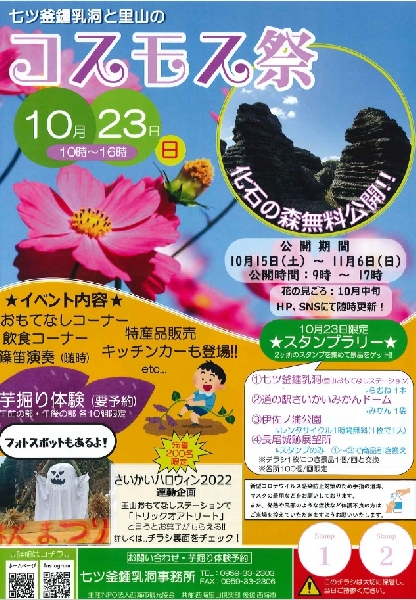 七ツ釜鍾乳洞とその周辺施設では、「七ツ釜鍾乳洞と里山のコスモス祭」「さいかいハロウィン2022」を令和4年10月15日(土)~11月6日(日)の期間に併せて開催いたします。