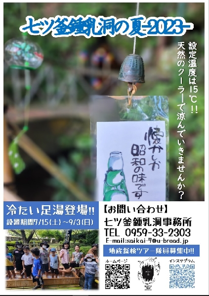 七ツ釜鍾乳洞は洞内の平均気温が15℃ととても涼しく、毎年県内外から多くのお客様が『涼』を求めてご来場いただいています。