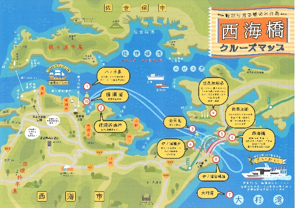 西海市西海町横瀬浦港を出港し、西海市と佐世保市針尾島の間「伊ノ浦瀬戸」を