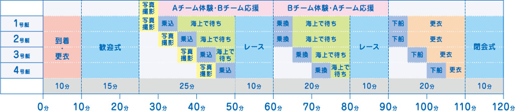 体験受入行程(40名×4クラス=160名、4艇、乗り換え有を想定した場合)※40名クラスをAチーム20名、Bチーム20名に分割
