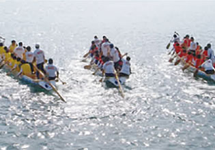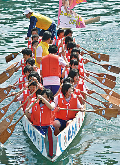 - チームごとにペーロン舟に乗り込む
